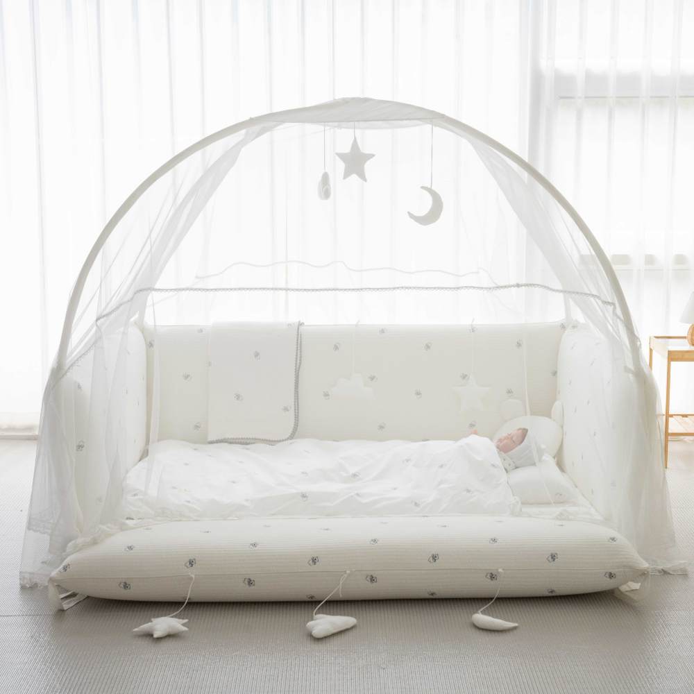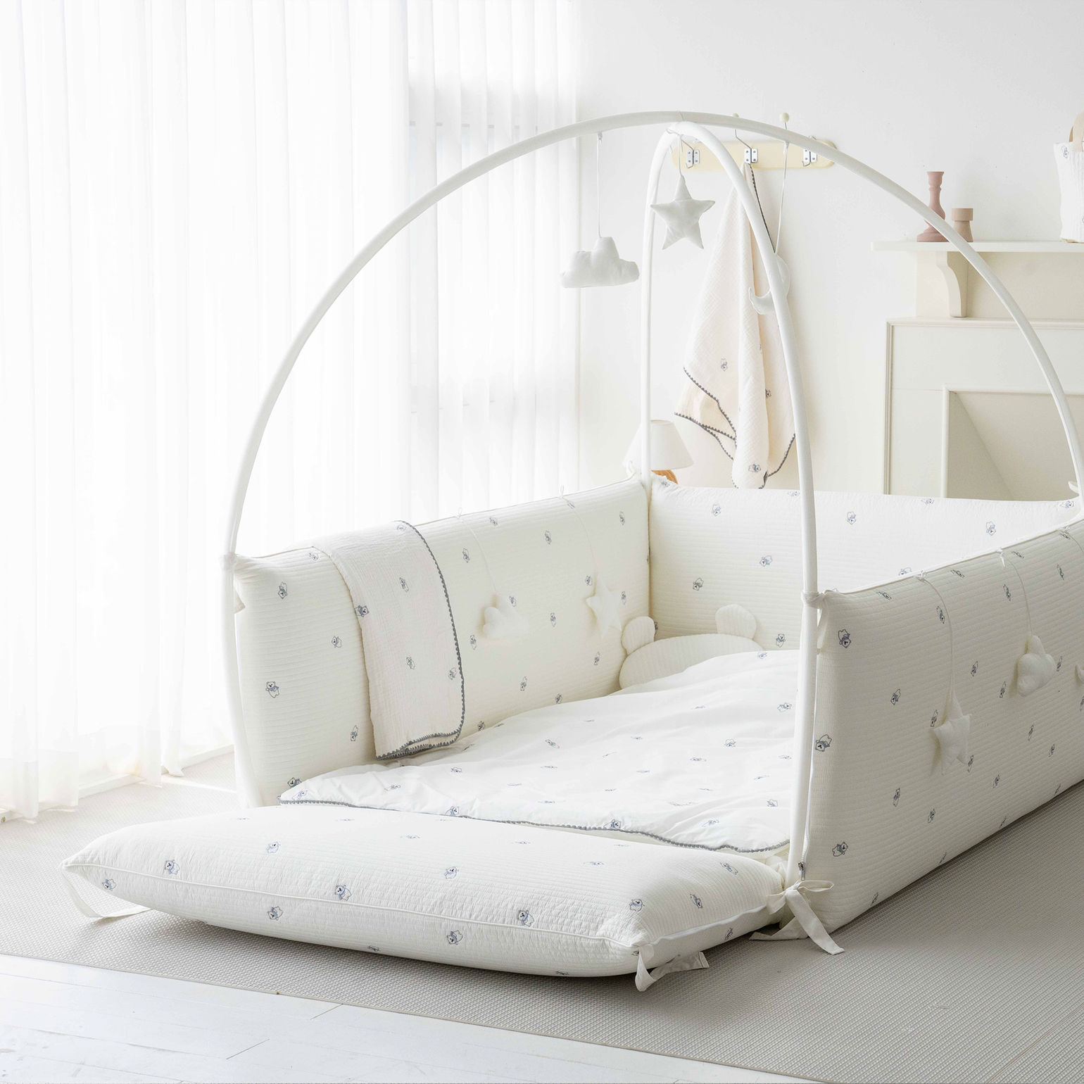 LOLBaby Cotton Embroidery Bumper Bed with Hanging Toy and Canopy - Cloud White