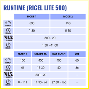 ➤ Max Flash Lumens : 500LM (Runtime 27:30 hrs)