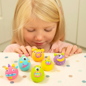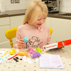 Create 6 monster shaped magnets with the soft air-drying modelling clay. Mould air-drying clay around polystyrene domes and decorate with wiggly eyes and adhesive magnets.