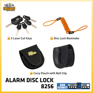 Secure your ride with our Alarm Disc Lock: ice spray-proof, double locking, 120dB alarm, auto arm/disarm, shock & motion sensors, 6mm steel pin.