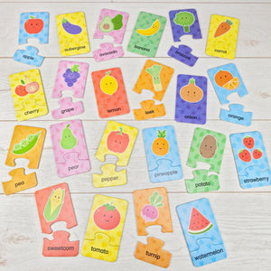 Help your child recognise different fruits and vegetables with these 22 fresh and colourful puzzles. Each 2-piece puzzle features a cute picture to match its name, encouraging word recognition and developing matching skills.