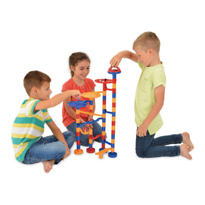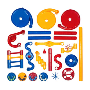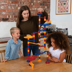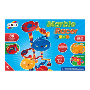 Build an exciting marble racing game for up to 4 players. Fully compatible with Galt Marble Run, this exciting construction set features 3 special racing pieces. A variety of chutes and wheels are also included for a really fascinating race. Starter top, starter base, finish, 3 racing vortex, wiggly bell chute, staircase, staircase support, curved chute with horizontal wheel, vertical wheel chute, paddle wheel, 'S' shaped chute, 4 straight chutes, 37 tubes, 4 bases and 20 marbles